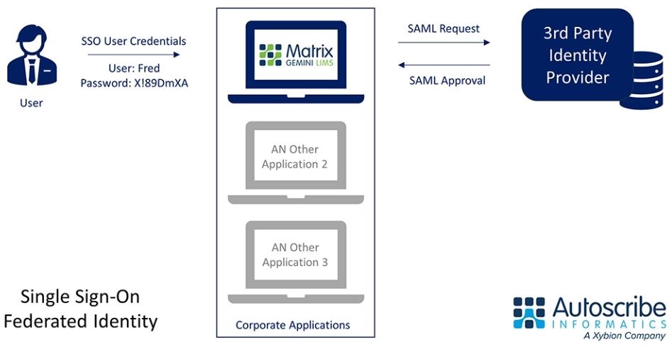 To login to an application, such as Matrix Gemini LIMS, the user opens the login screen within the application as before. However, rather than use the username/password authentication process built into the application it hands off the SSO process to the third-party identity provider using SAML (Security Assertion Markup Language). Once the third-party application authenticates the user and approves access the application opens as usual.